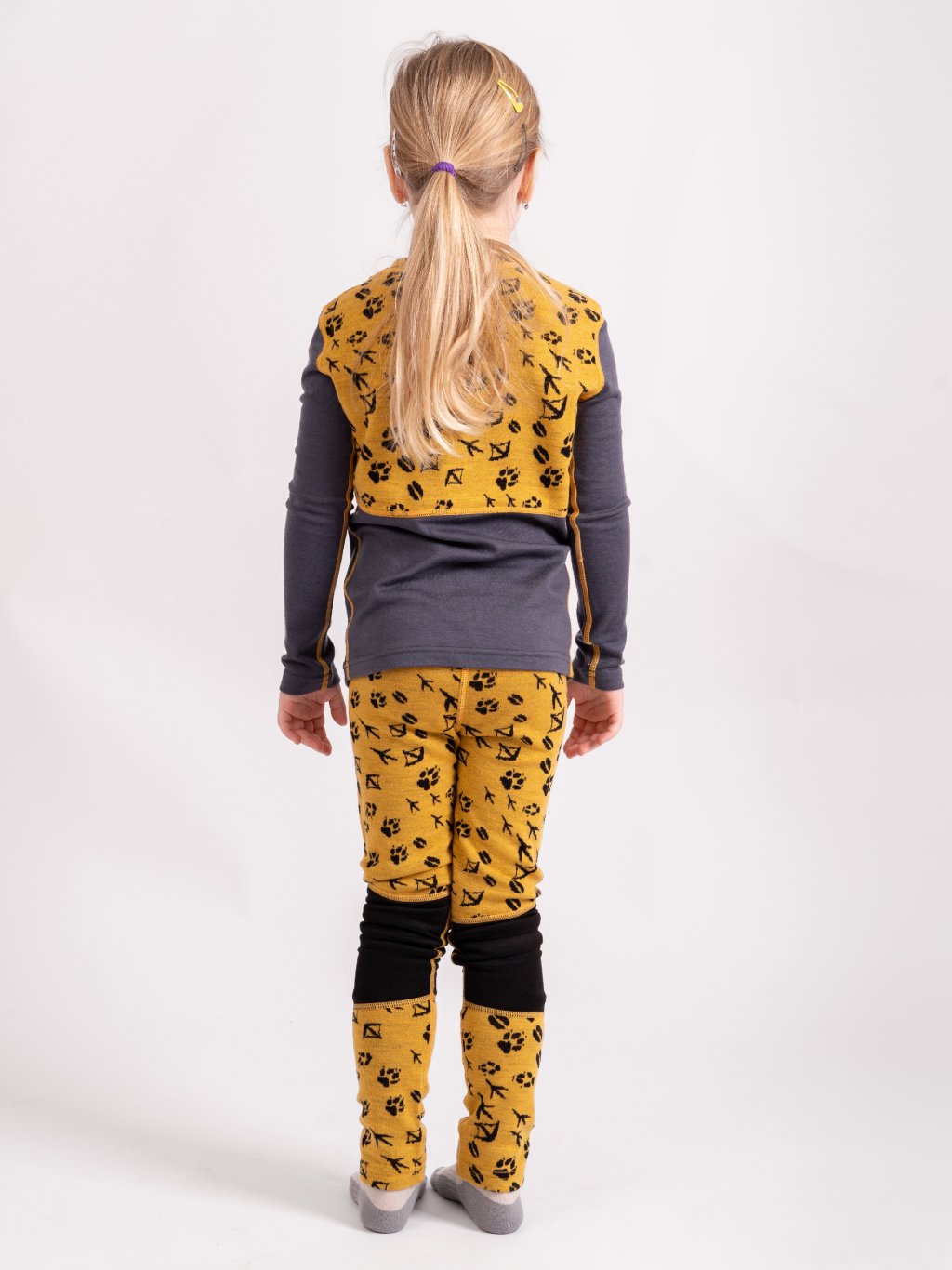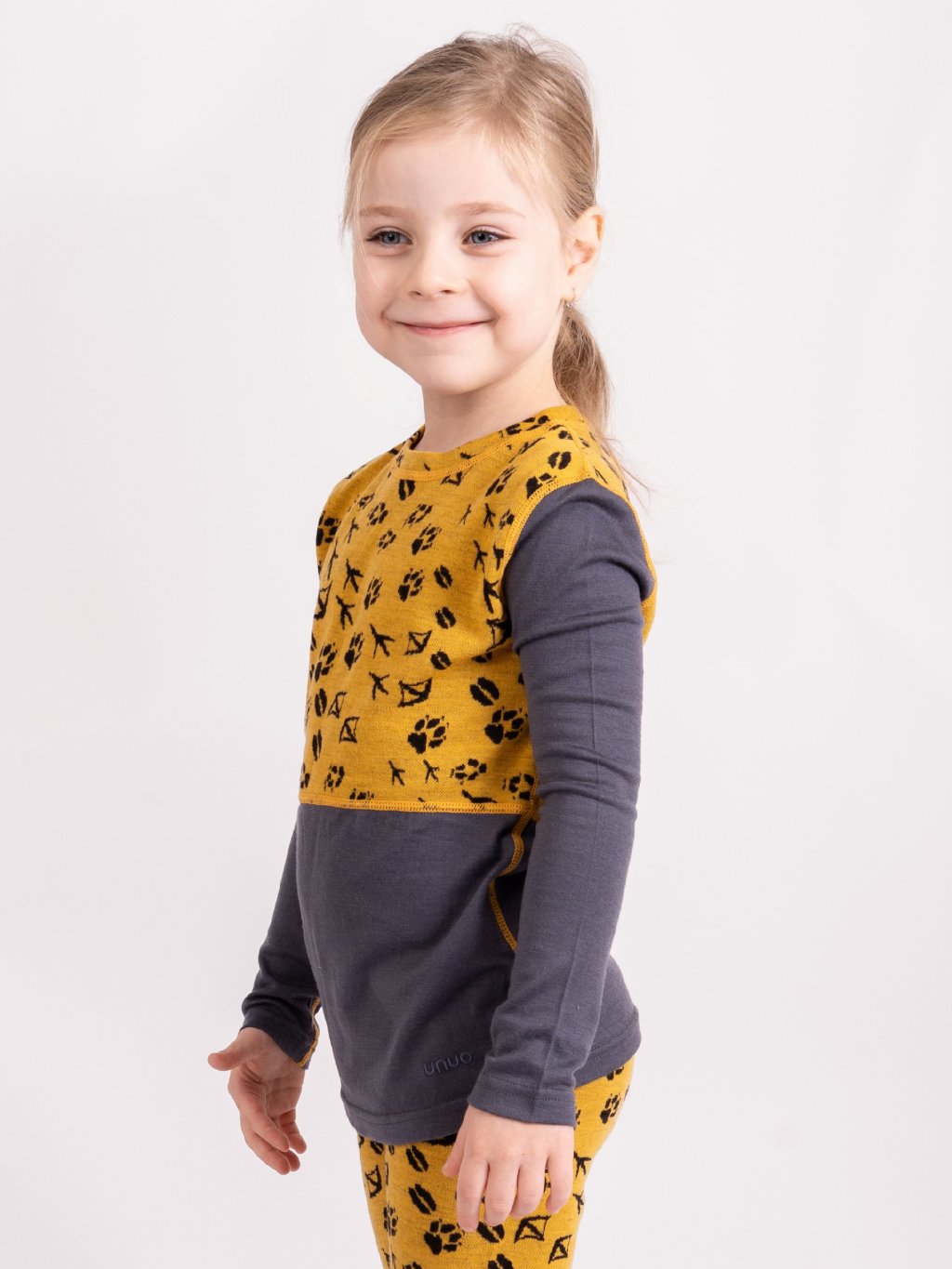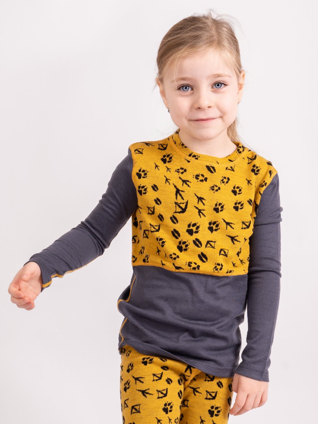 Dziecięca koszula merino z długim rękawem Nature, Musztarda, Leśne ślady