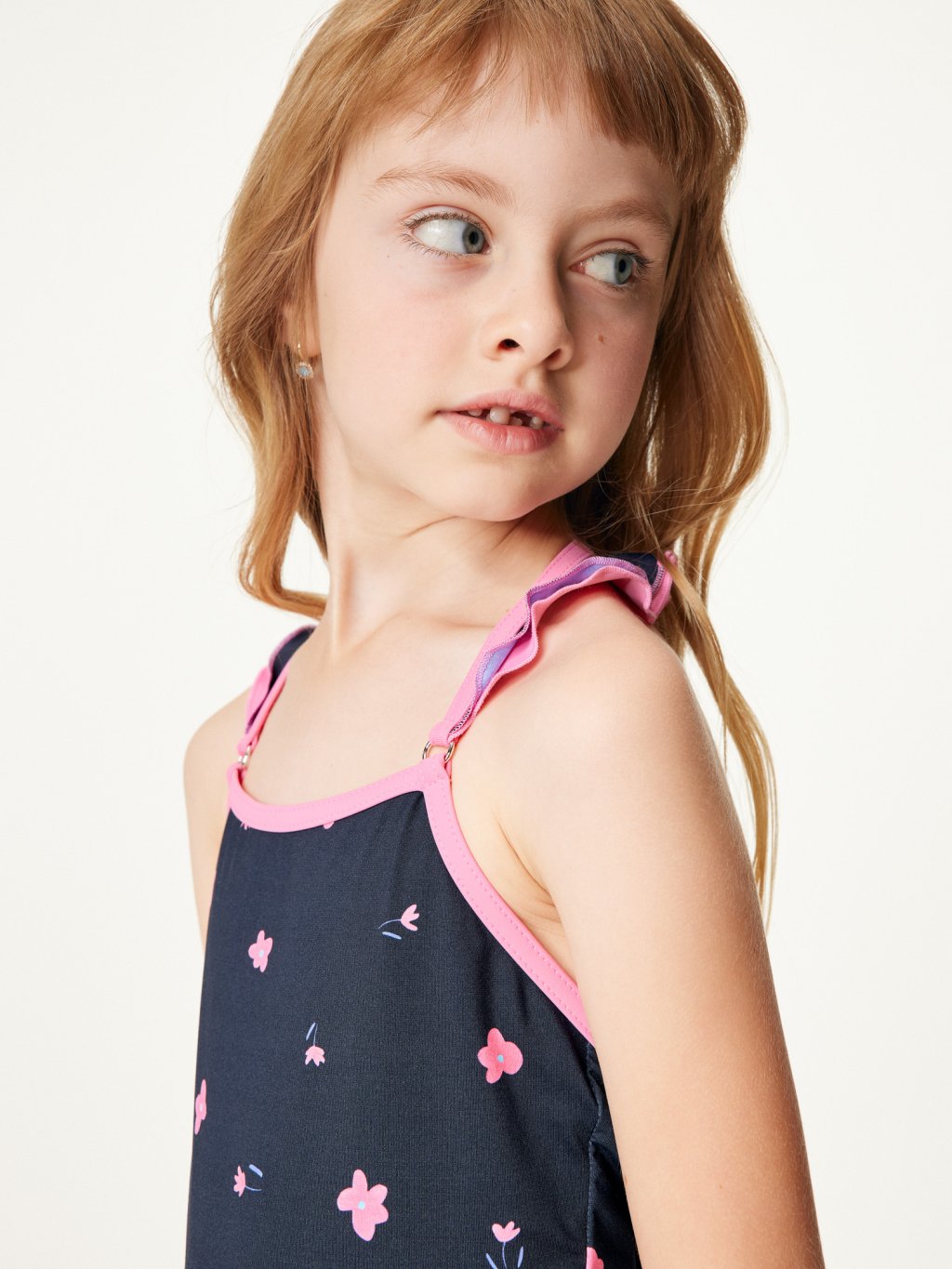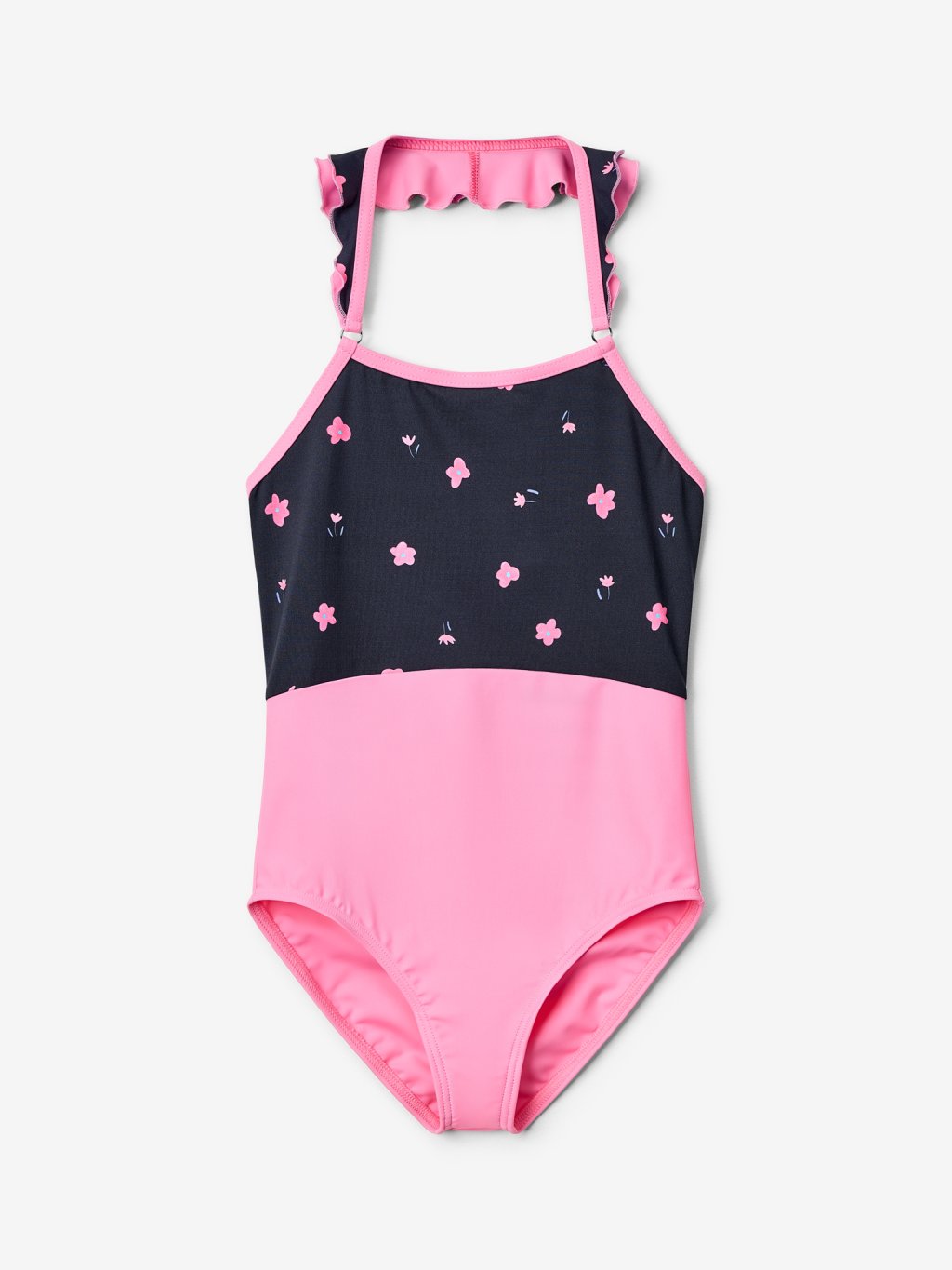 Dziewczęcy jednoczęściowy strój kąpielowy z ochroną UV 50, Różowy, Kwiaty