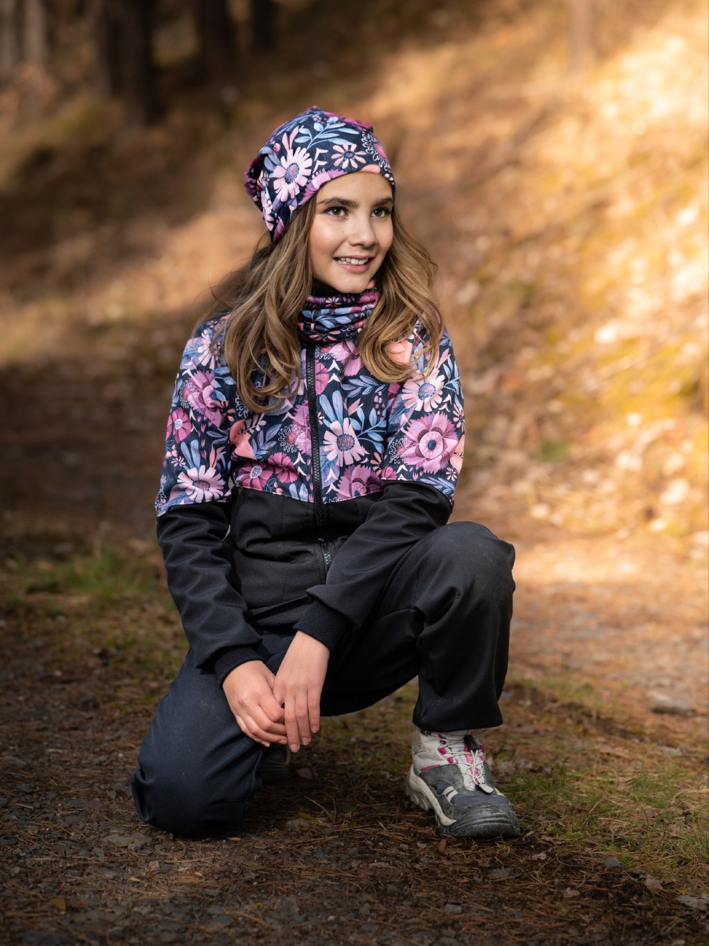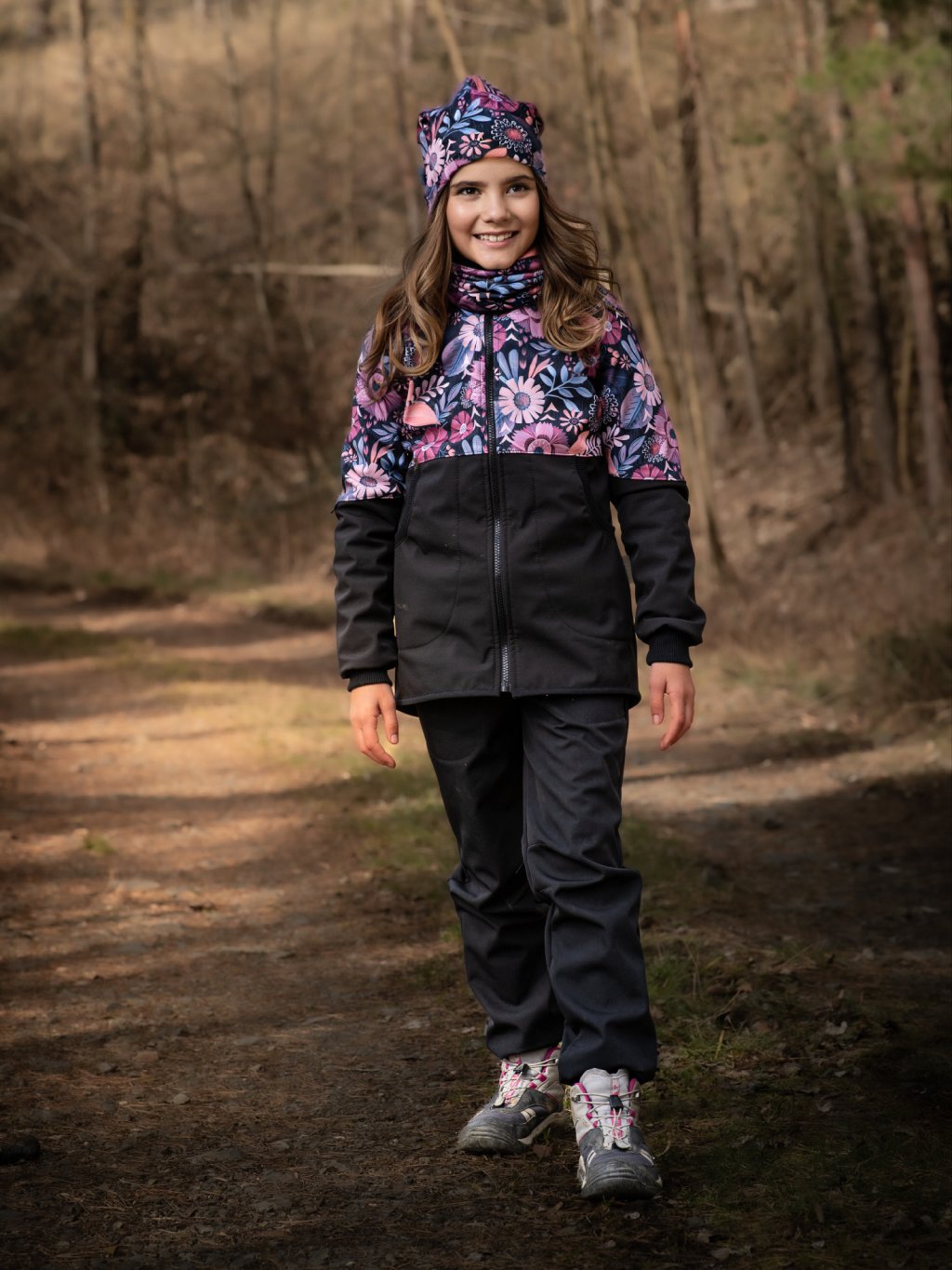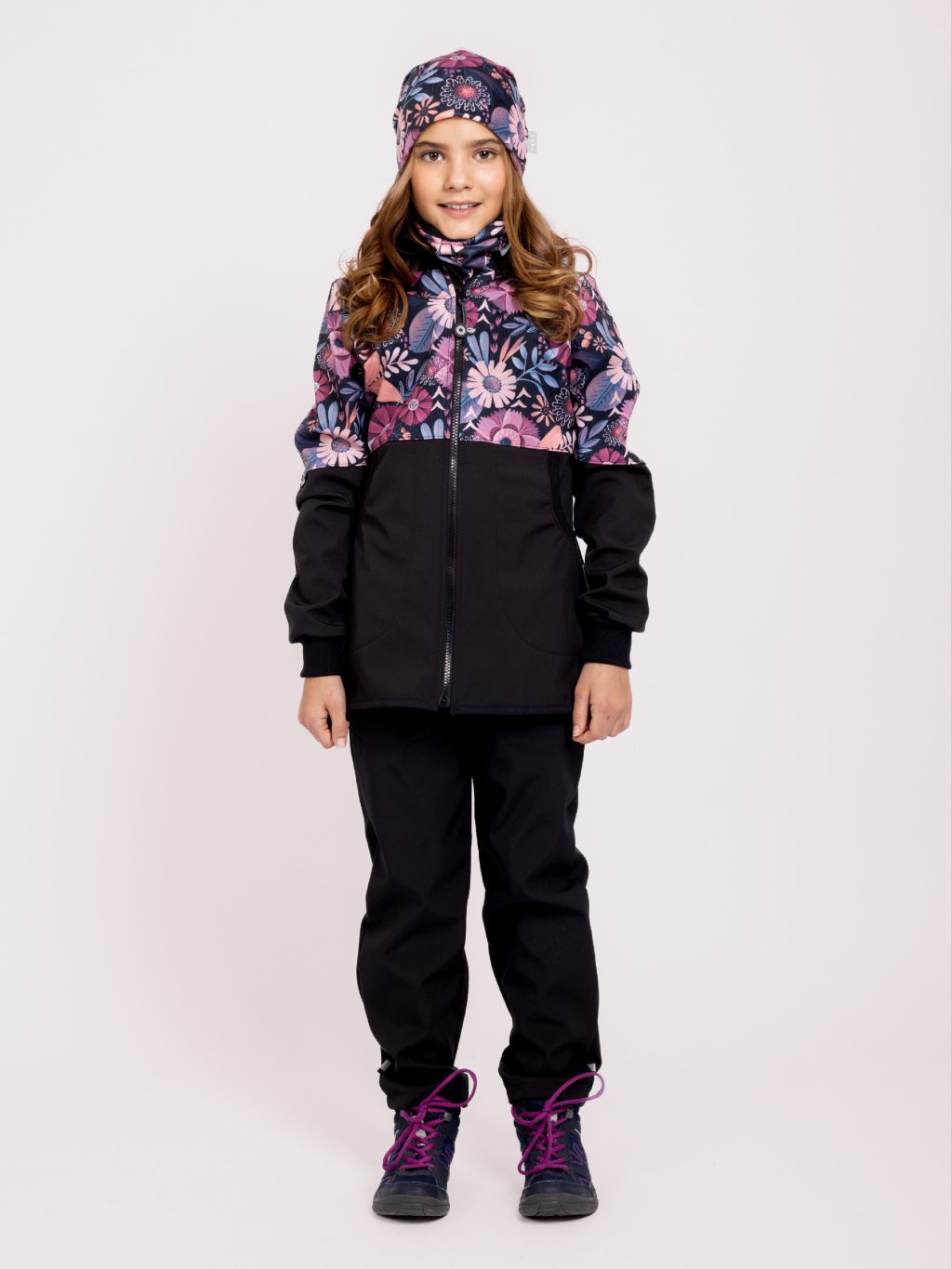 Płaszcz softshell dziewczęcy z polarem Street, Czarny, Magiczne kwiaty